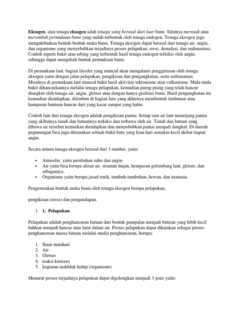 T0c6jvbnx1dl M from static.fdokumen.com Tenaga eksogen merupakan tenaga yang dapat merombak dan merubah bentuk muka bumi atau bentang lahan yang telah ada. Tenaga eksogen adalah tenaga yang berasal dari luar perut bumi sehingga dapat merombak dan merubah bentuk bumi bumi atau bentang lahan yang ada. Sementara, tenaga yang berasal dari luar bumi disebut dengan eksogen. Tenaga eksogen adalah tenaga yang mempengaruhi bentuk permukaan bumi yang disebabkan oleh tenaga yang berasal dari luar bumi itu sendiri. Namun tenaga dari eksogen ini tersedia dari berbagai sumber yang nantinya dapat mengakibatkan sejumlah proses. Ablasi atau erosi sungai adalah peristiwa erosi yang disebabkan oleh aliran air yang menyebabkan batuan menjadi terkikis akibat jalur yang dilewatinya. Gelombang yang bergerak akan menyebabkan pergerakan berbagai material laut. Tenaga eksogen adalah tenaga yang berasal dari luar bumi yang sifatnya merusak.